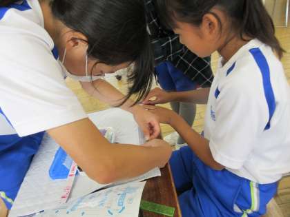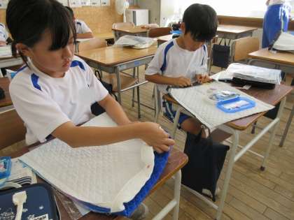 ミシンで縫う前に、まち針を打って縫うところを整えます。だんだんできあがっていくことにわくわくして取り組んでいます。