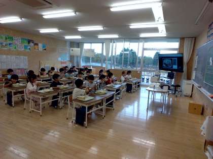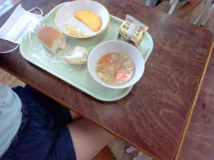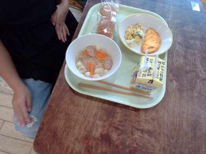 今日の給食で、マカロニスープの中に、☆やハートの形を見つけて、大喜び。