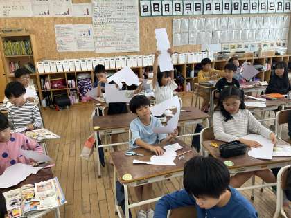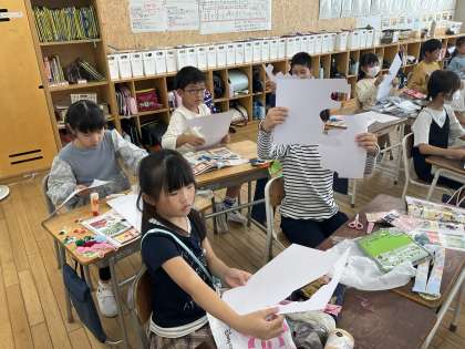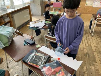 図画工作科で、いろいろな布や包装紙などの模様を生かしてコラージュする学習がはじまりました。まずは、世界で一つだけの台紙をつくるところからスタートです。思い思いのオリジナル台紙が、出来上がりました。この上にどんな世界を表現しようか楽しみにしていました。