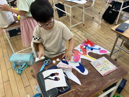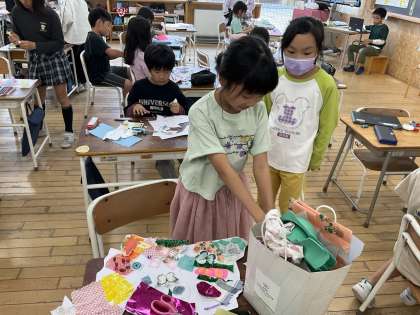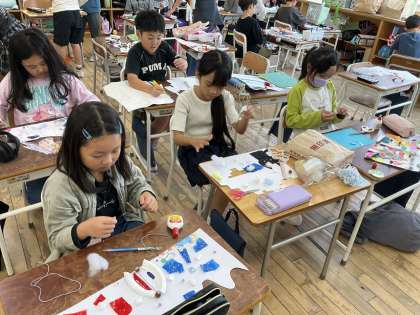 図画工作科で、包装紙や布等、質感の異なる素材や模様を生かしてコラージュする学習をしています。イメージを広げながら楽しくつくっています。