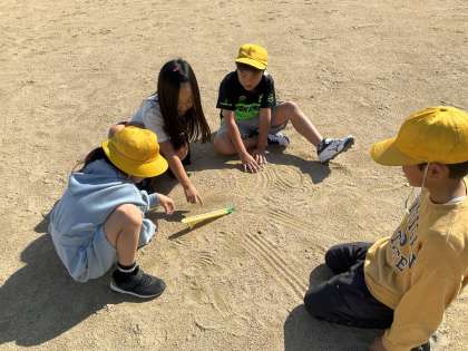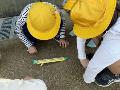 太陽の下で実験をしていると「暑いなぁ」という声が上がりました。「どこに行ったら涼しいかな」と投げかけると「日陰」とみんなは答えます。みんなで日陰に移動すると「涼しい!」とみんな一息です。そこで「日向と日陰とどのくらい温度が違うのかな」と投げかけ、日陰と日向の地面の温度を調べたり、実際に地面を触って温度の違いや確かめました。
