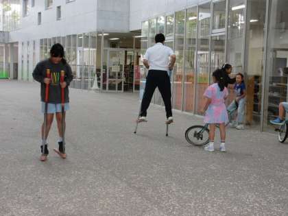 休み時間のパサージュでは、子どもも先生も一輪車や竹馬の練習に余念がありません。