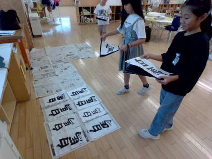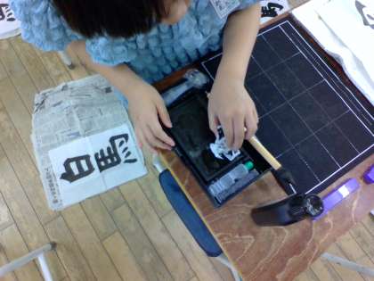 作品を出すときは、下敷きに乗せたまま、周りの人に墨がつかないように持ってきます。