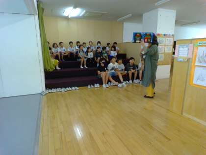 国語科で学習している「くじらぐも」の作者 中川李枝子さんによる「ぐりとぐら」の拡大絵本の読み聞かせや、10月にぴったりのハロウィーンの英語のお話など、さまざまなお話を聞かせていただきました。