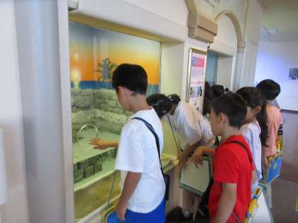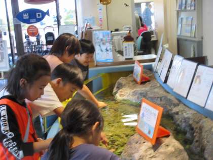 海の生き物とのふれあいコーナーです。手をきれいにしてくれる魚や海辺の生き物などを実際にさわってふれ合いました。