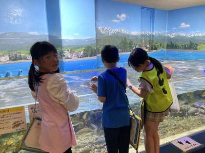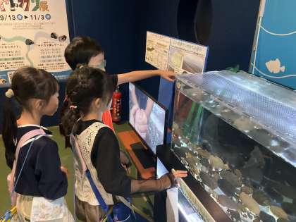 富山の河川コーナーです。身の回りにいる海の生き物たちに、興味津々です。