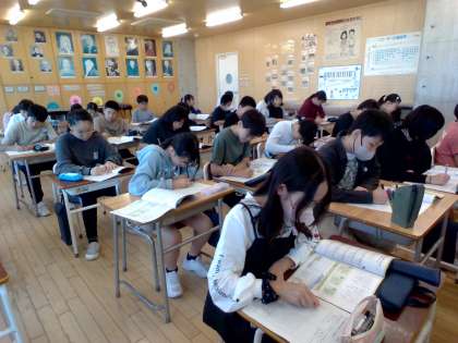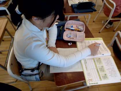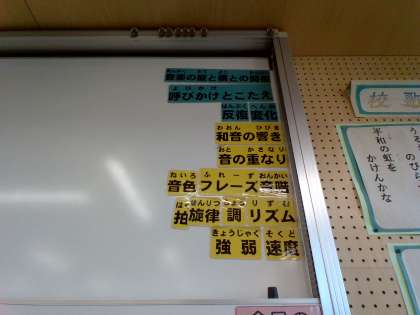 6年生 音楽科 曲想の移り変わりを味わおう 公開日 2024/10/29 更新日 2024/10/29 6年生のページ 今日は、楽器の演奏曲ではなく、歌唱曲を聴いて、曲想の変化を楽しむ学習を行っています。 音楽室の黒板には、音楽科の学習で使う「音楽言葉」がはってあります。 それらの言葉や習った記号を使ったり、歌詞から感じ取ったことを考えたりし、それぞれが味わった曲想の移り変わりを表現しています。