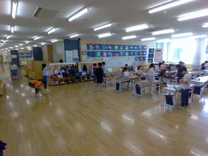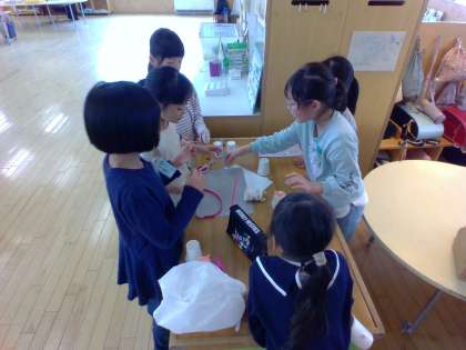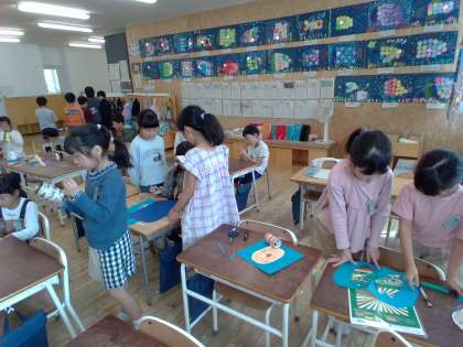 2年生 生活科 動くおもちゃ 公開日 2024/10/29 更新日 2024/10/29 2年生のページ 1時間目は国語科で「お手紙」の授業をしていた学級が、4時間目にはこのように様変わりし、今度は生活科のおもちゃの世界にどっぷり使って学習をしています。 それぞれが場所を決めて、作ったおもちゃの動きを確かめたり、もっと改良をしたいと工夫を重ねたりしています。 少し動きが良くなると、「みてみて!」とうれしそうに成果を報告し合っていました。