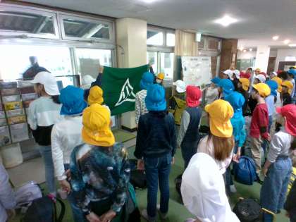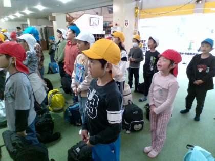 校旗を手に持って掲げ、校歌を元気よく歌いました。