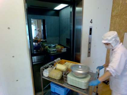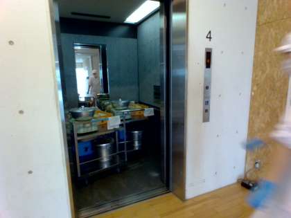 4時間目の終わり頃、中学校側の1階エレベーターから次々に運搬車が上がってきます。