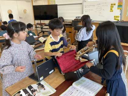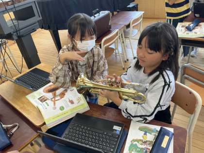 三年生は音楽の時間にトランペットについて学習しました。教科書でトランペットのパーツの名前を調べたりトランペットを使って演奏された曲を聞いて感じたことを伝え合ったりしました。実際にトランペットを触って、楽器に親しみました。