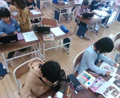 1年生は、来週の遠足で、パズルづくりを行います。学校では、どのようなパズルにしたいかを考えて、図案を書きました。クロームブックで参考にしたいイラストを調べることができるようになってきています。素敵なオリジナルパズルに仕上がるといいですね!