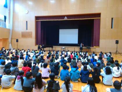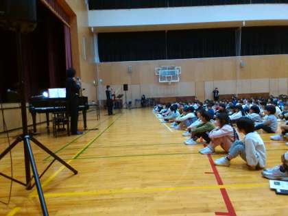 今日は、テレビ番組などにも出演されている「スギテツ」さんを招いての音楽鑑賞会です。3時間目は1年生から3年生が鑑賞しました。