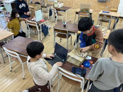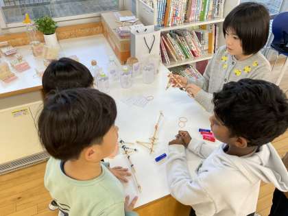 友達のおもちゃを試しながら、工夫やよさを見つけています。