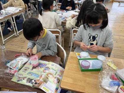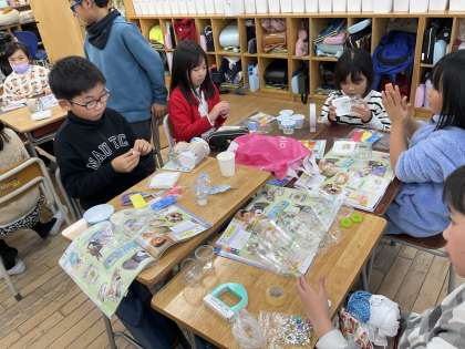 3年生は図画工作科の学習で「空き容器の変身」という学習をしました。まず、プラスチックの容器や空きビンを組み合わせて、好きな形をつくります。次に、粘土をつけて、イメージを形にします。色の組み合わせを考えながら楽しくつくりました。