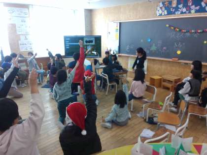 クリスマス前ということもあり、サンタクロースの帽子を被ったり、赤や緑で教室を飾ったりしながら、クイズやゲームを楽しんでいました。