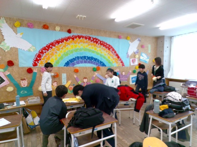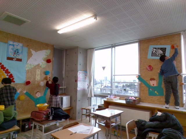 5年生が6年教室の卒業に向けた飾りつけをしていました