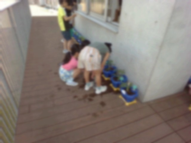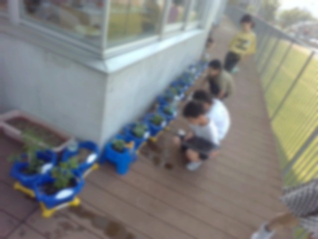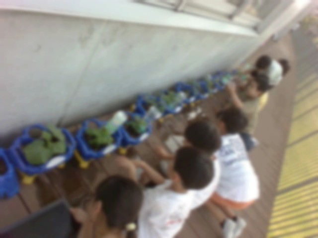朝、登校し、準備が終わった子どもたちは、一目散にベランダに向かい、野菜の健康観察をしています。