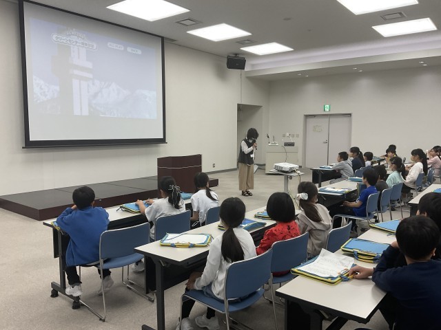 クリーンセンターに到着しました。はじめにDVDで施設の紹介や設備の説明を聞いています。みんな真剣に聞きながらメモをとっていました。