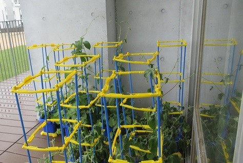 一人一人が育てている朝顔が、いよいよ支柱を越えて茎を伸ばしているものが出てきました。