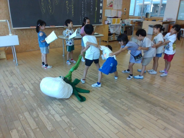 発表の際は、大きなかぶの模型を使って発表しました。かぶが抜けたときには、お話にでてきた登場人物さながらに、大喜びする姿も見られました。