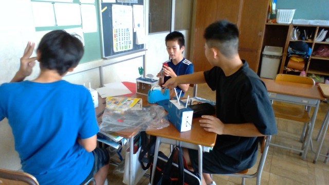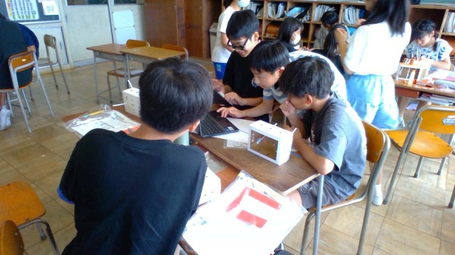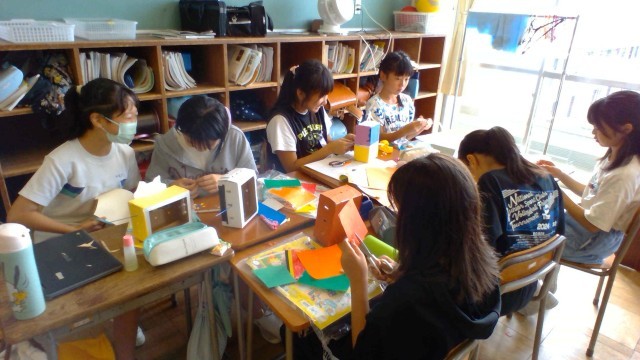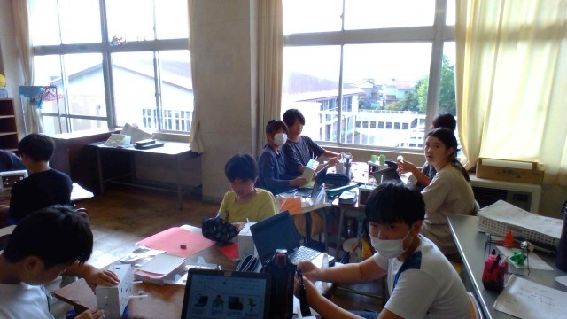 図画工作科「くるくるクランク」の学習では、子供たちは、クランクの動きを生かして作品づくりを行っています。色画用紙や折り紙を用いて、思い思いの作品をつくっています。