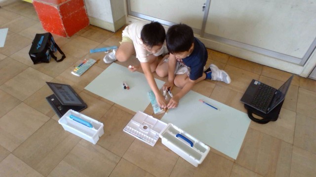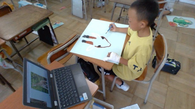 先週、校外学習で行ったファミリーパークの生き物を水彩やクレヨンなどで描きました。撮った写真や画像を見ながら真剣に描いていたり、友達とどんな風に描くとよいか相談したりしていました。