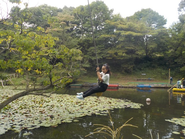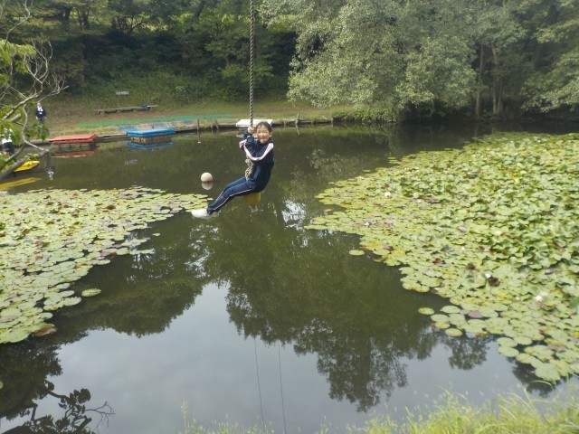 昼食の後は、野外活動を行いました。写真はターザンロープの様子です。最初は少し怖がっていた子も2回目からは「もっと高くしてほしい」とスリル感を楽しんでいました。