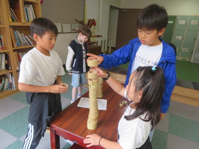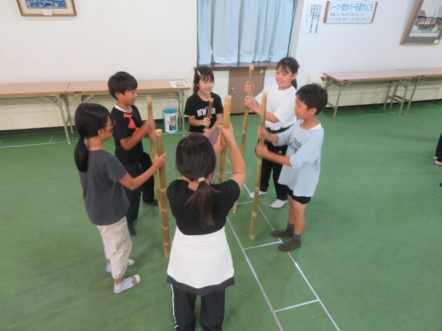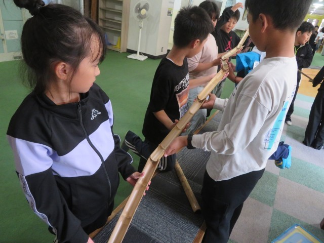 最後の活動はバンブーチャレンジです。班で協力して竹を使ってさまざまな種目にチャレンジしました。