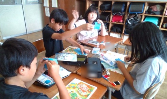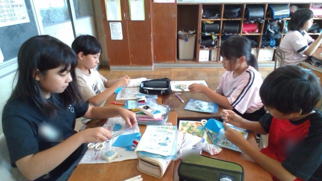家庭科では、縫い方や縫う順序を考えながら小物を作っています。「丈夫に縫うために本返し縫いにしたほうがいいかな」「入れた物が落ちないようにボタンもつけたいな」等と友達と話しながら作り方を考えていました。