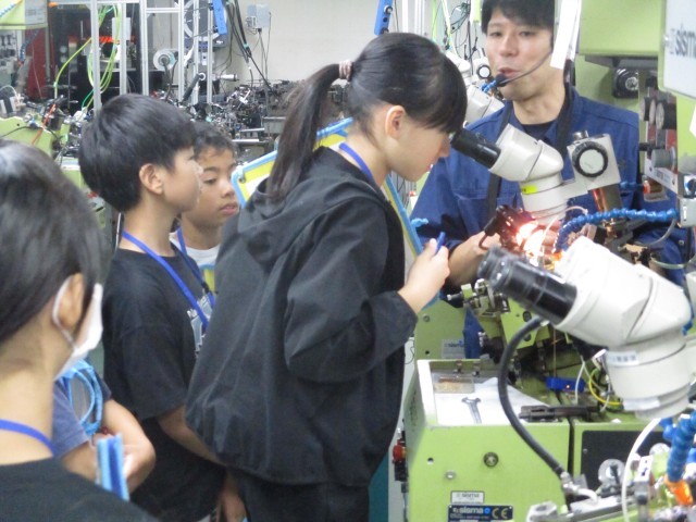 山森製鎖さんへ見学に行きました。工場内の見学とジュエリーの製作体験をさせていただきました。工場見学では、美を追求し、輝きを出すための工程を見させていただき、社員の方々の熱意を感じることができました。製作体験ではネックレスをつくりました。ネックレスをつなぐ「丸カン」を取り付ける作業が非常に難しかったですが、子供たちは根気強く取り組んでいました。出来上がると、嬉しさのあまりすぐに試着し、鏡の前で出来上がりを確認して喜んでいました。