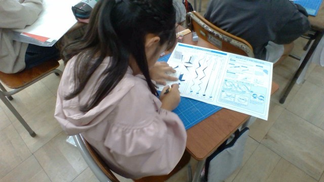 鉛筆と同じような持ち方でカッターを使ってみました。窓の形や描くものなど、どんなデザインの作品にするか考えました。