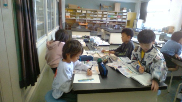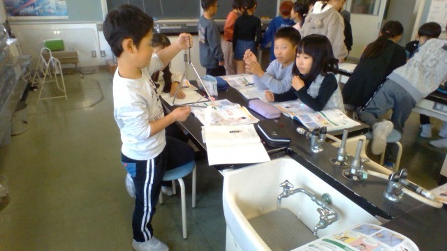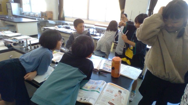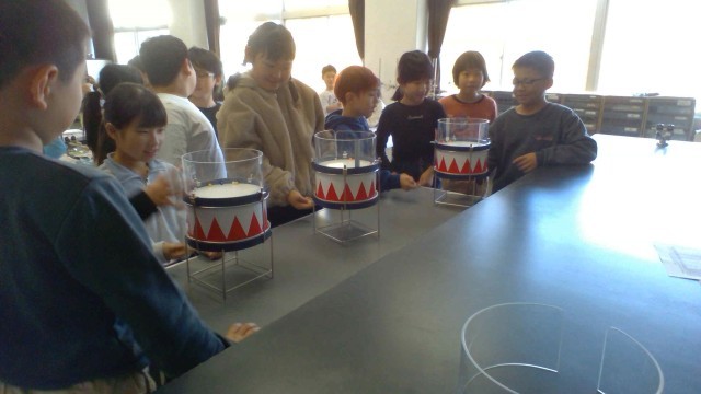 トライアングルや太鼓を使って、音が出ているときの物の様子を調べました。