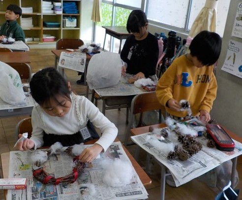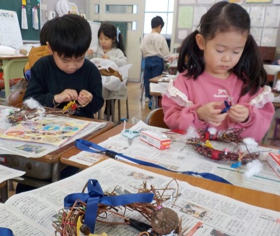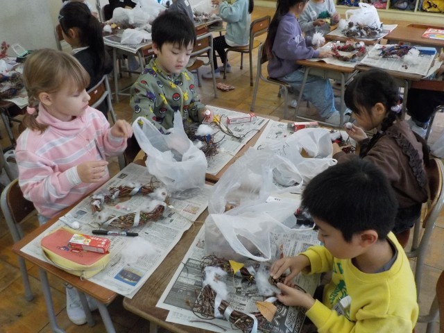 秋見つけで拾ったどんぐりやイチョウの葉を使って、リースをかざりつけました。