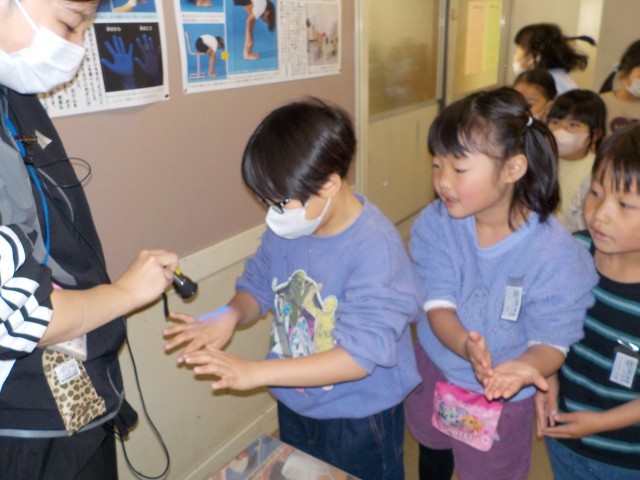 洗い残しが光ります。自分の手洗いはどうだったかな? インフルエンザも流行しています。しっかり手洗いをして、感染予防に努めたいですね。