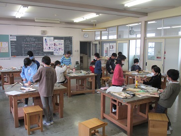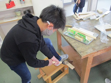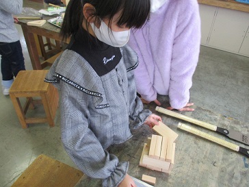 4年生の図画工作科の学習では、木材を「のこぎりで切る」、「かなづちでくぎを打ってくっつける」、「紙やすりでけずる」等の作業をしながら作品を仕上げています。設計図を見ながら、一人一人が部品の模様や形を工夫して作業を進めています。「細かい部品をつけたいから、気をつけてのこぎりで切ろう」や「くぎも並べて打てば、模様になってすてきだよ」など、楽しく安全に作業をしています。仕上がりがとても楽しみです。