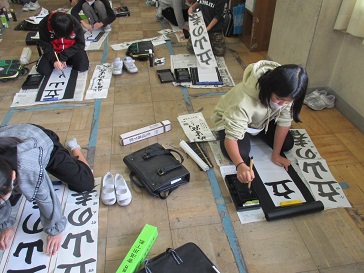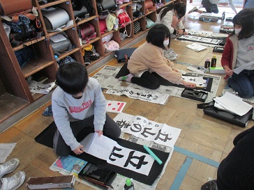 4年生は「立山の春」を書き初めで練習しています。前回の自分の字と比べて、「もっときちんと立の字の止めをがんばりたいな」と練習したり、「のという字を書くときには、筆の動かし方を工夫したらいいよ」と仲間にアドバイスをしたりして練習に励んでいます。一文字一文字、ていねいに練習している姿が多く見られました。