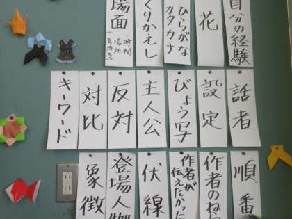 掲示には、国語の物語を読み解くときの「鍵」となるものが並んでいます。