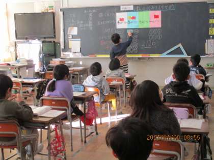 朝日の差し込む教室で算数を学習しています。