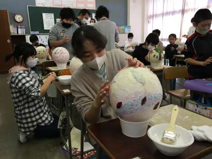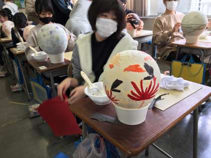 プロの職人さんに来ていただき和紙のランプシェードづくりに取り組みました。真っ白な和紙の上に思い思いの模様を貼っていきました。とても集中していました。子供のアイディアはすばらしいと職人さんからも言っていただきました。