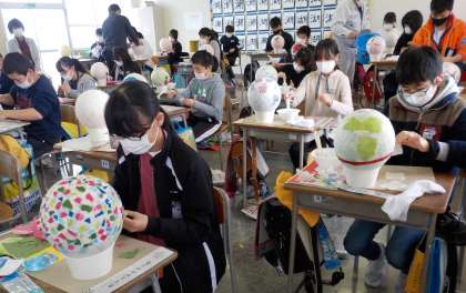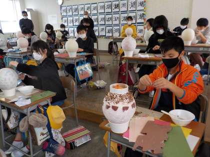 自分で貼った模様の上に再度白い和紙を貼りました。和紙を重ねながら丁寧に取り組みました。教室で現在乾燥中です。完成が楽しみです。