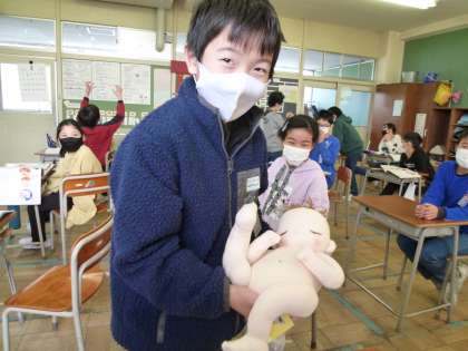 「意外に重いぞ。」「こんなに大きいんだ。お母さん大変そう。」という声があちらこちらから聞こえました。どの子の表情もやわらかくなりました。