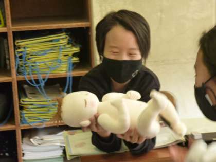 本物の赤ちゃんに見立てた人形を抱き、重さを実感したり、実物大の絵を切り取って比べたりしました。