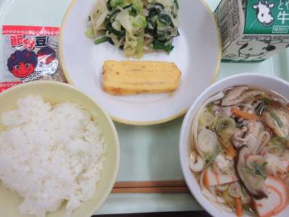 かやくうどん はりはり和え 厚焼き卵 ごはん、牛乳 節分豆 今日は、節分です。