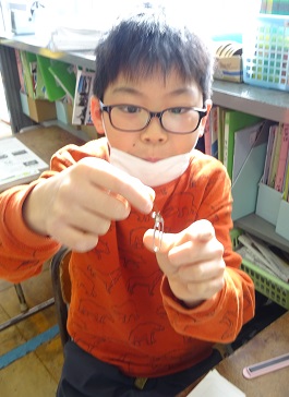 先月、理科で磁石を触っていろいろなものに近づける実験をしました。「色が銀色の物につくのかな?」「電気を通す物と同じで金属がつくんじゃない?」「あれ?クリップと安全ピンがくっついた!」など、子供たちの頭の中には、たくさんのはてな(?)やびっくり(!)が生まれたようです。実験結果をノートにまとめ、そこから考えたことを出し合いました。
