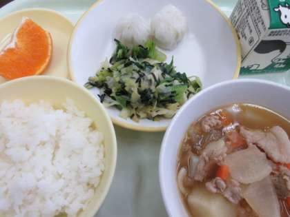 じゃがいもの中華煮 磯和え(チンゲンサイ、キャベツ、のり) えび包子 ごはん、牛乳 甘平