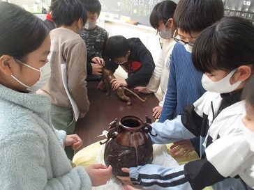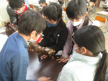 今日の学習では、実際の高岡銅器の置物と花瓶を手にとって、「高岡銅器はなぜ全国に広がり、400年以上も作り続けているのだろう?」について考えました。「お、思ったよりも重い…。」「銅がこんなにひんやりと冷たいなんて初めて知った!」「模様や形がとても細かいね。職人さんが一つ一つ丁寧に作っているんだろうな!」と、驚きと感心の声があちこちから聞こえてきました。「高岡に住んだ昔の鋳物師さんたちが広げた技術や分業の仕組みなど、いろいろな工夫や努力があっての高岡銅器なんだね」と考えを広げる学習となりました。