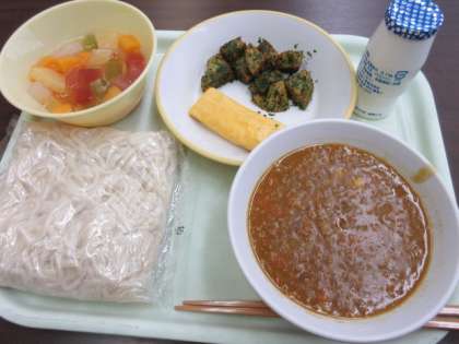 ソフト麺 カレーソース 青のりポテト 卵ロール フルーツカクテル 飲むヨーグルト です。