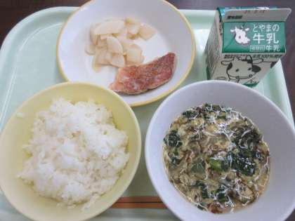 かぶの甘酢和え あか魚の塩焼き 卵ともずくのスープ ごはん、牛乳 です。