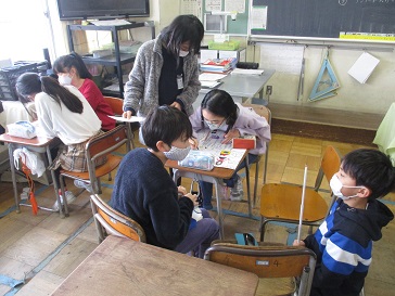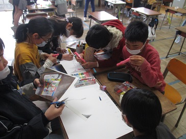 「学年のみんなのことをもっと知り合うためには?」と考えたグループでは、みんなにアンケートをして集計し、結果をどう新聞などで伝えようか話し合いを続けています。